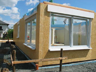 Das "Container-Haus" von der anderen Seite. Hier sind zwei Wohnzimmerfenster (noch gardinenlos) zu sehen