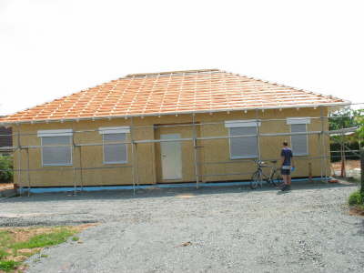 Und so sah das Haus dann am Abend aus. Dazwischen gab es auch noch einige Fotos, aber die wurden mit einer normalen Kamera gemacht und sind noch nicht entwickelt. Lohnenswert ist aber noch der Blick auf die Seite "Das Problem"!!!! Ab nächster Woche geht der Innenausbau mit Hochdruck weiter: Elektro, Heizung, Sanitär kommen dann dran.