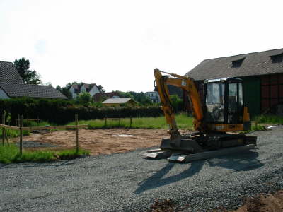 Obwohl Jannick ja schon kräftig gebuddelt hat, wird jetzt doch etwas größeres Gerät eingesetzt. Als nächstes soll jetzt die Bodenplatte erstellt werden.